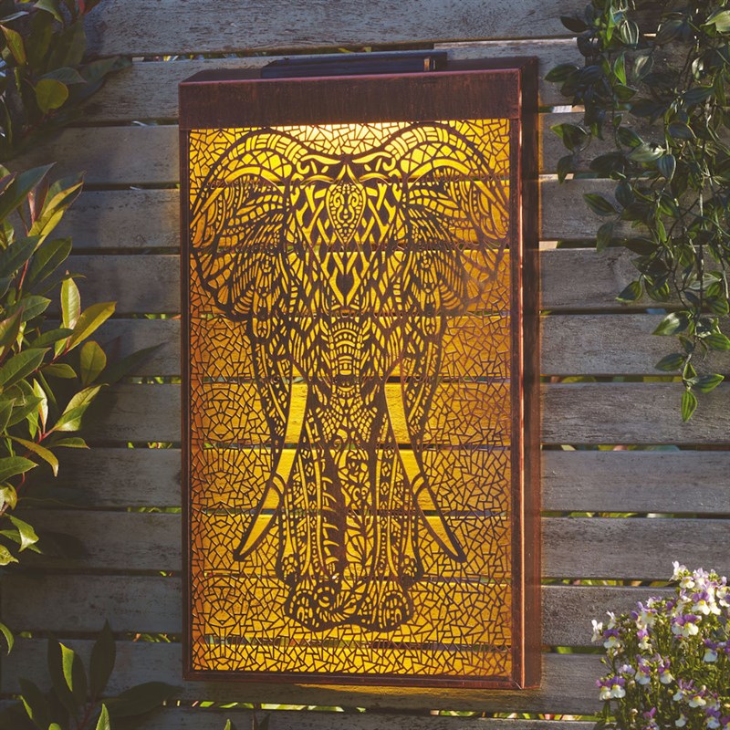 - Intricately detailed elephant design with warm LED solar back-lighting