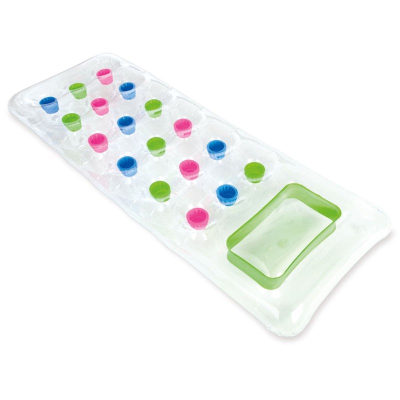 A transparent inflatable mat with 18 colourful pockets, a window and two air chambers.