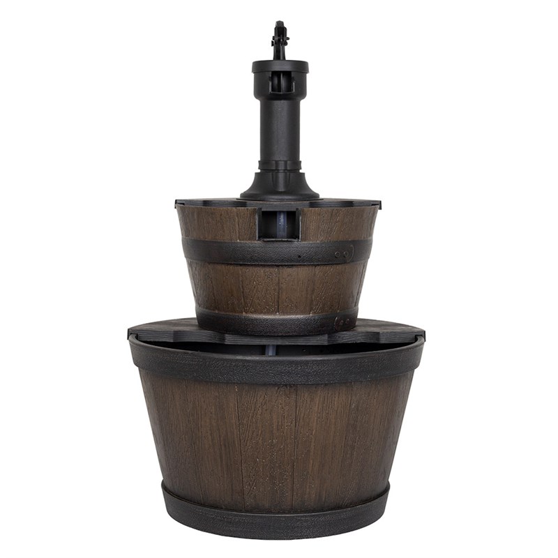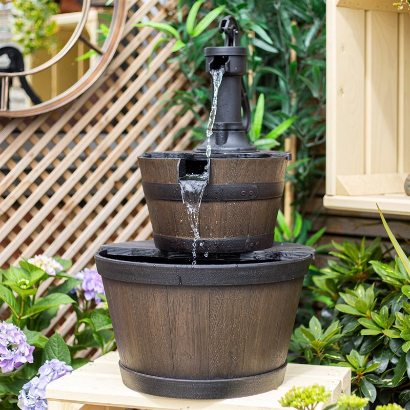 This calming and seamless flow of water begins with the replica of an antique water pump spilling into two cascading half-whiskey barrels below. A mains-powered water pump recirculates water from the bottom bowl back to the top of the unit using the bottom bowl as a reservoir.