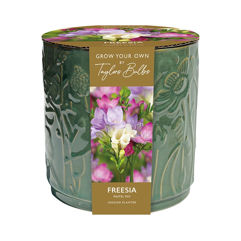 The Freesia Pastel Mix Indoor Planter Set includes 5 bulbs that produce delightful freesia blooms in a perfect mix of elegant pastel shades. With its wonderful fragrance and charming funnel-shaped flowers the blooms are perfectly enhanced by the beautiful floral ceramic pot in elegant dark teal tones.