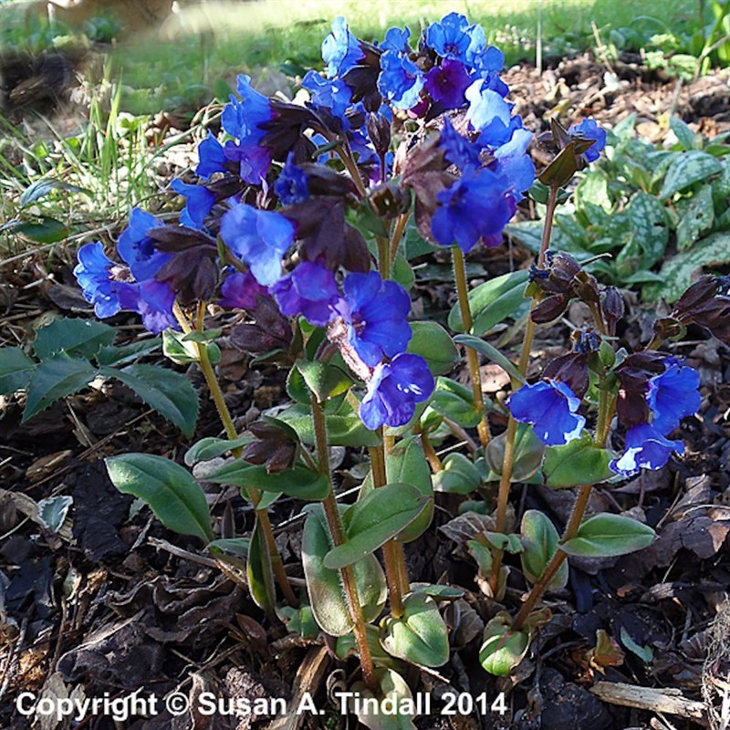 Evergreen perennial (herbaceous) with green leaves and blue flowers in Spring.