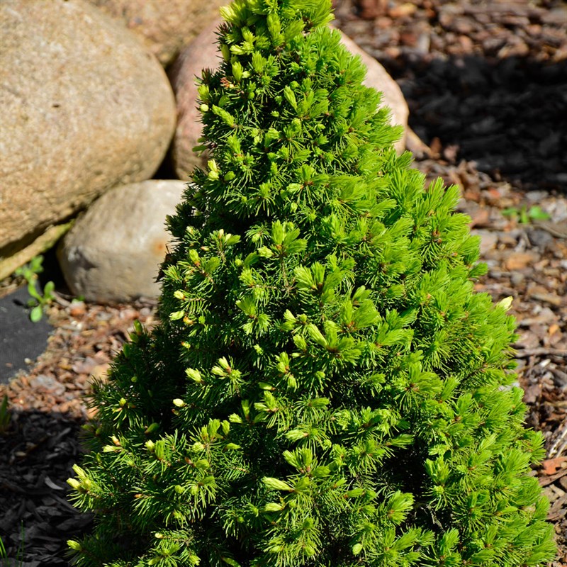 A neat and cone shaped dwarf evergreen conifer with light green needles turing blue-green.