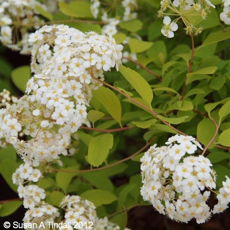 A vigerous growing, semi-evergreen shrub with arched branches and diamond shaped dark green leaves. Dense, clustered bowl shaped flowers appear along branches during early summer.