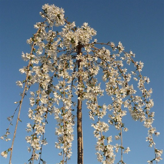 Small weeping cherry tree with long branches smothered with small white flowers in late Spring. Excellent autumn leaf colours of burgundy and orange-reds. Suitable for most soils, even in the smallest garden.