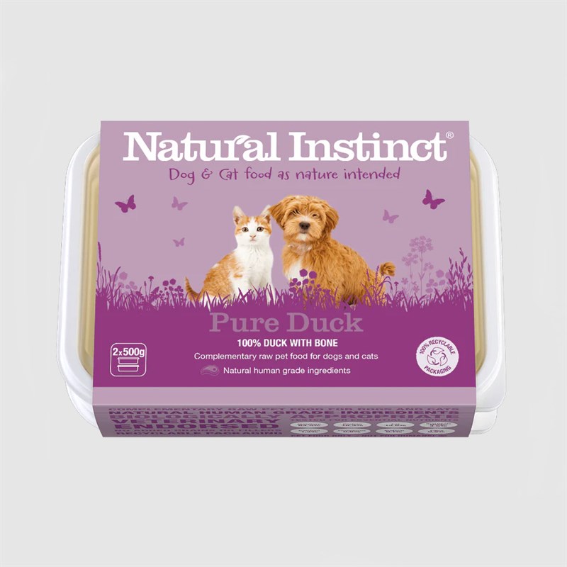 Natural Instinct's Pure Duck is a complementary raw frozen dog and cat food recipe. Full of flavour, this single-protein recipe contains 100% human-grade duck meat, making it an excellent alternative for dogs and cats with other protein allergies. Use this delicious, healthy duck recipe to customise your pet's diet, whether you use it as a tasty treat or add your choice of veggies and fruits to make a balanced, complete meal, the choice is yours.